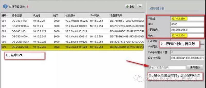 你会搜到同一个交换机/直连的海康设备。选中IPC,在右侧修改IP,输入密码,点击保存就完成修改IP的任务啦~如果修改后摄像头的IP和你的电脑IP在同一网段(一般为前3位一样,如:我电脑IP是10.16.2.113,摄像头的IP是10.16.2.250,前三位相同,那么电脑和摄像头就在同一网段。)就可以在IE浏览器里输入该IP,进行预览、配置等操作了。(自己电脑的IP是多少呢?百度一下吧!)